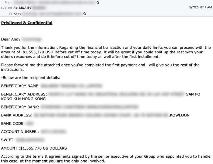 According to Agari’s investigation, an attack typically begins with the gang’s impersonation of a company’s CEO, asking a targeted employee to work with “external legal counsel” to co-ordinate payments required to close a fake corporate merger or acquisition. Of course, the scammers also require the targeted employee to keep details of the transaction strictly confidential because of their “sensitive nature.”