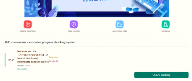 The user is redirected to a web page in Chinese where the order number and a valid date for the appointment for vaccination are shown. Victims need to choose between Bank or UPI as the final payment method.