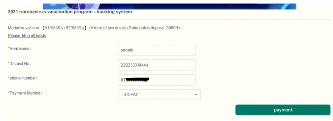 While booking the slot, scammers ask for personal information, including name, ID card number, and contact information. The website does not validate any information given by the victim. Instead, directly asks for the payment mode.