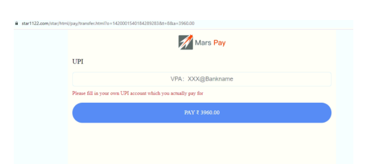Under this method, the user is redirected to https://star1122.com, where they are asked to enter UPI account details.