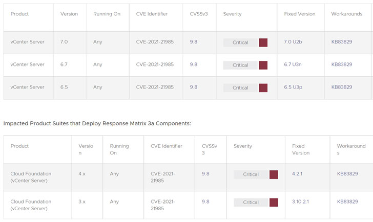 The fixes for the vCenter flaws also come after the company patched another critical remote code execution bug in VMware vRealize Business for Cloud (CVE-2021-21984, CVSS score: 9.8) due to an unauthorized endpoint that could be exploited by a malicious actor with network access to run arbitrary code on the appliance.