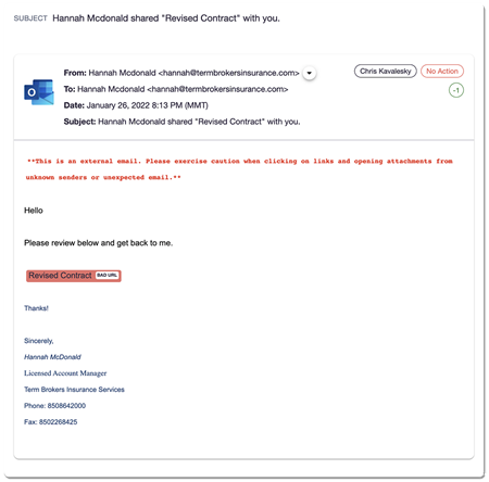 The phishing emails successfully evaded traditional email security measures in part because they came from a domain belonging to Term Insurance Brokers. The report noted that “a quick scan of the domain address would not have alerted the end user of fraudulent activity because of the domain’s validity. In the payment industry this domain would have passed most of the custom defined policies, further increasing end users’ chance of falling victim to this sophisticated phishing attack.”