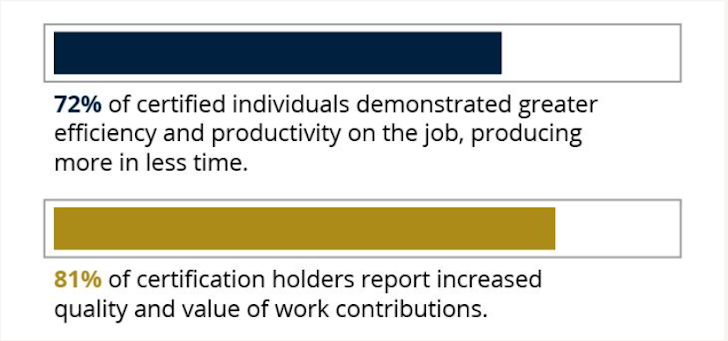 Employers also reap significant rewards from having certified professionals on their teams. Certified employees bring enhanced skills and knowledge to their roles, leading to increased productivity and innovation. The data shows that 72% of certified individuals demonstrated greater efficiency, while 81% reported an increase in the quality and value of their work contributions. Furthermore, certified professionals tend to have greater work autonomy, with 74% experiencing more independence, which fosters a culture of innovation within organizations.