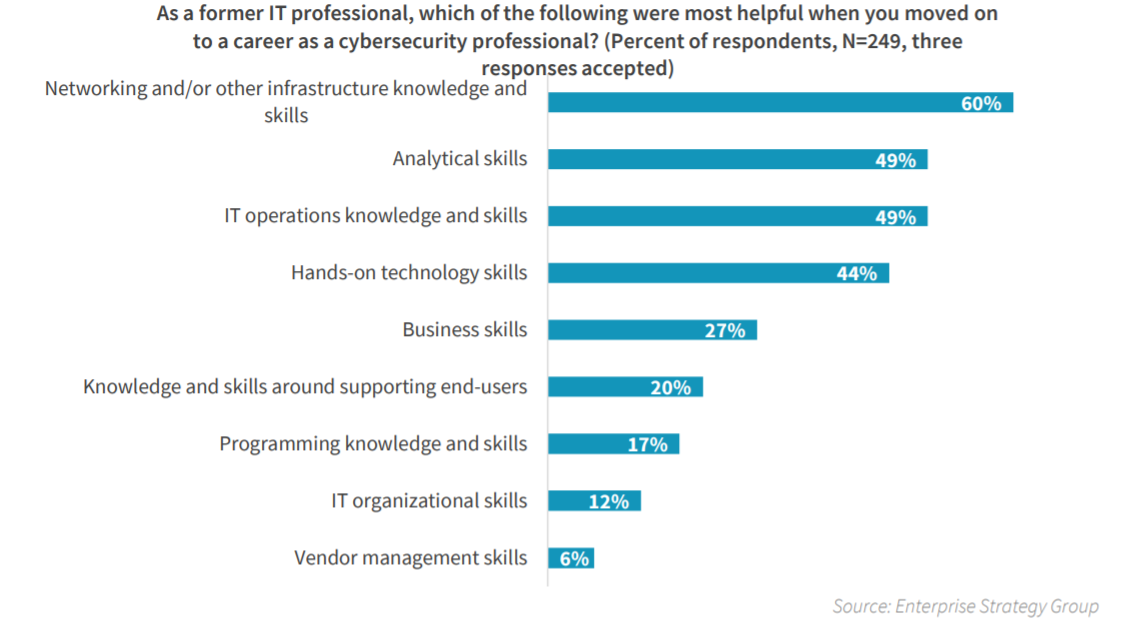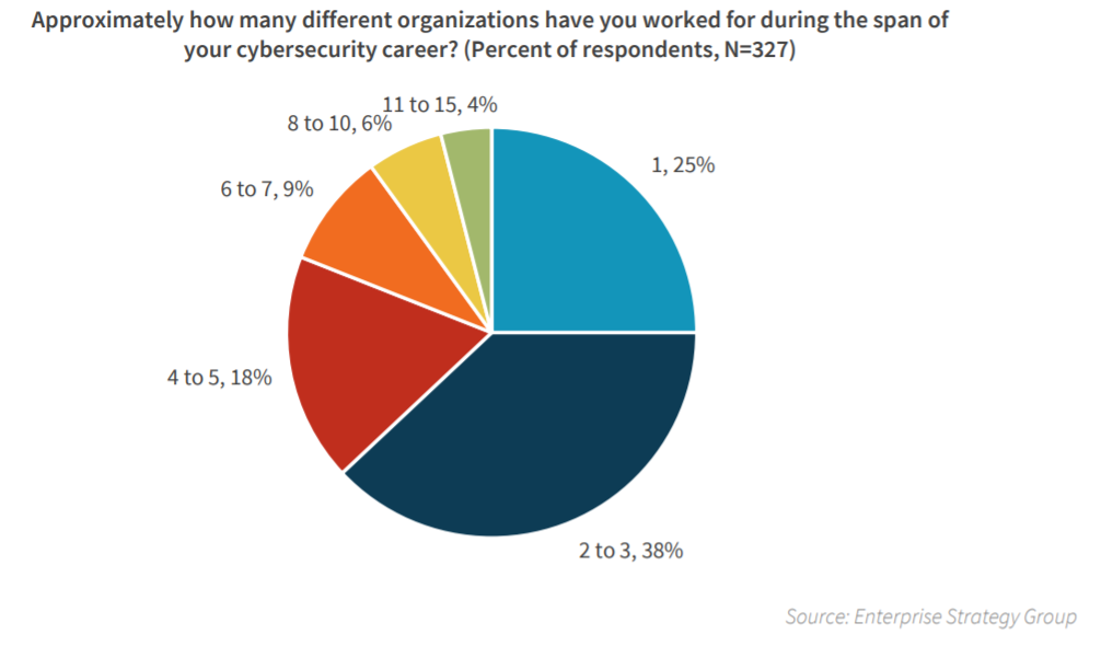 The survey also found that many professionals start out in IT, and find themselves working in cybersecurity without a complete skill set. A full 63 percent of respondents in the survey said they’ve worked in cybersecurity for less than three years, with 76 percent starting as IT professionals before switching their career to cybersecurity.
