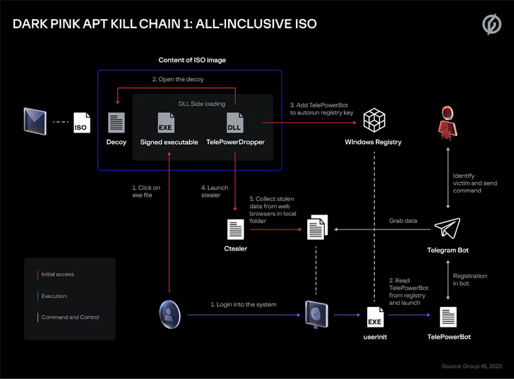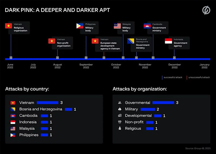 Singapore-headquartered Group-IB, in a report shared with The Hacker News, said it’s tracking the ongoing campaign under the name Dark Pink and attributed seven successful attacks to the adversarial collective between June and December 2022.