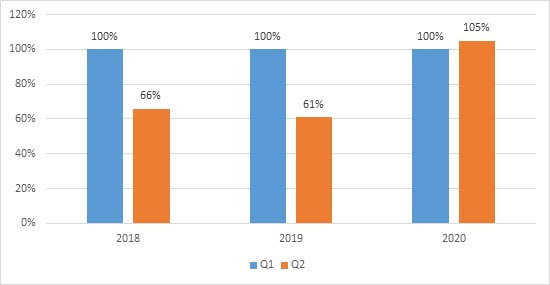 The difference between Q1 and Q2 through 2018-2020. Q1 of each year is taken as 100 percent.