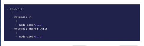 Synk illustrated the nested dependency tree, shown below, which illustrates “how node-ipc trickles into the Vue.js CLI npm package and further promotes the need to vet nested dependencies as a holistic risk.”