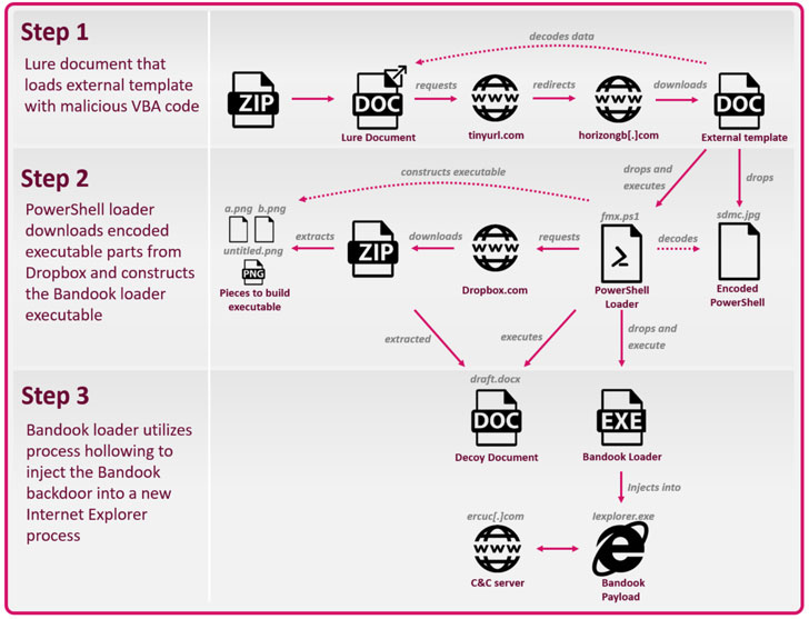 In the last phase of the attack, this PowerShell script is used to download encoded executable parts from cloud storage services like Dropbox or Bitbucket in order to assemble the Bandook loader, which then takes the responsibility of injecting the RAT into a new Internet Explorer process.