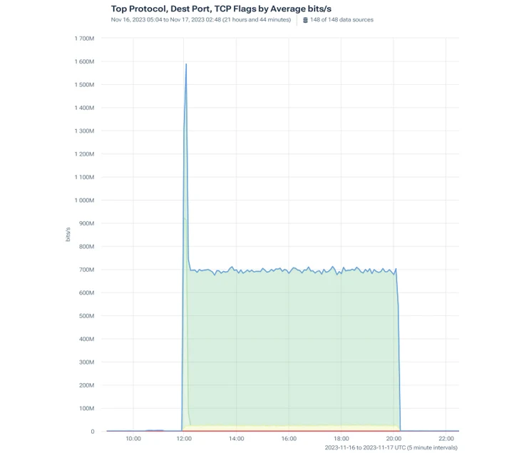 | The attack’s consistent traffic volume was 700 Mbps and at the onset peaked at 1600 Mbps |