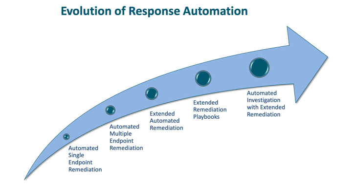As depicted in the chart above, Cynet frames the five increasingly capable levels of response automation, along with the specific benefits provided by each. The most basic type of response automation involves remediating a specific threat in response to an alert on an endpoint. This, Cynet says, is table stakes for any threat detection and response (TDR) solution.