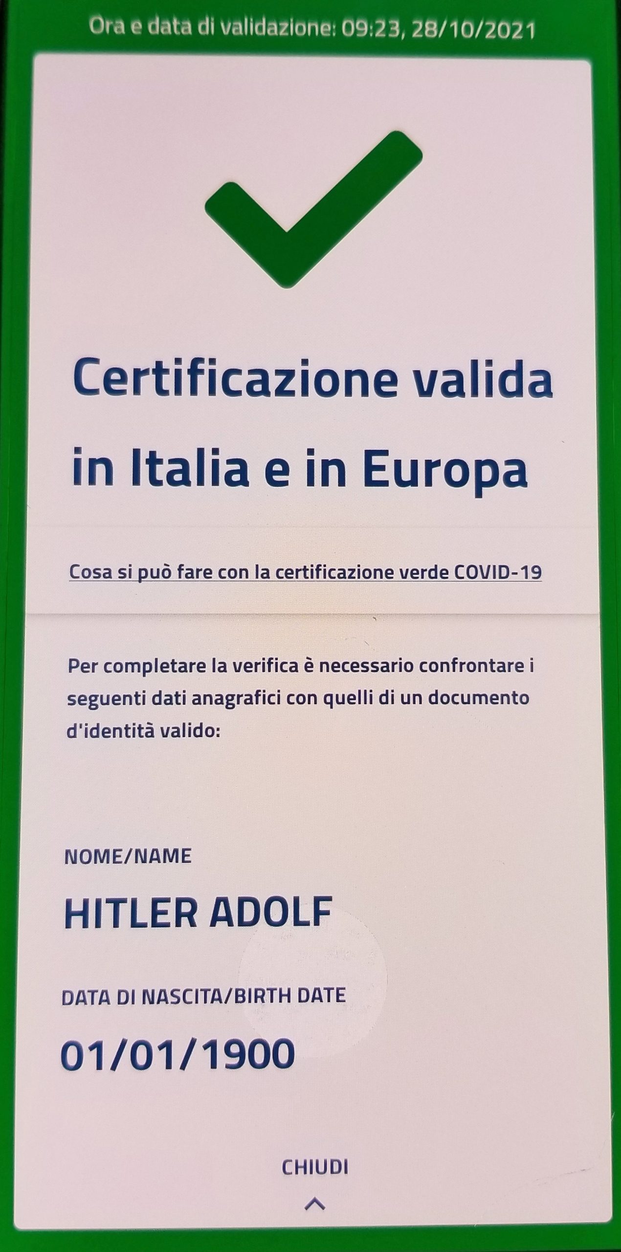 The private key used to verify Hitler’s pass was reportedly revoked as of Wednesday, but there were multiple reports of working certificates still being sold online. Threatpost confirmed this on Thursday morning by using the official Verifica C19 app to scan a QR code that had been shared on Twitter by a penetration tester.