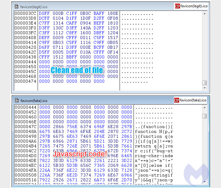 In several instances, Malwarebytes found that legitimate websites (e.g., “cigarpage.com”) were hacked and injected with an innocuous piece of code referencing an icon file that loads a copycat version of the favicon from the decoy site (“cigarpaqe[.]com”).