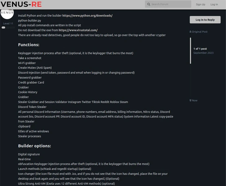 ExelaStealer is offered for sale via cybercrime forums as well as a dedicated Telegram channel set up by its operators who go by the online alias quicaxd. The paid-for version costs $20 a month, $45 for three months, or $120 for a lifetime license.