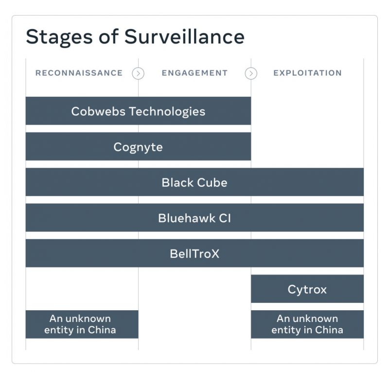 In a report (PDF) entitled “Threat Report on the Surveillance-for-Hire Industry” released on Thursday, Meta said that following a months-long investigation, removed 1,500 fake accounts linked to the spying entities’ reconnaissance of, engagement with, and/or exploitation of the alleged victims.