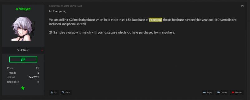 One of the most popular theories about the outage concerned a supposed attack that led to 1.5 billion Facebook records being sold on the RaidForums criminal forum. The conspiracy sprang from a Sept. 22 post from a supposed company called X2Emails that advertised “[a] database which hold more than 1.5b Database of Facebook these database scraped this year and 100% emails are included and phone as well.”