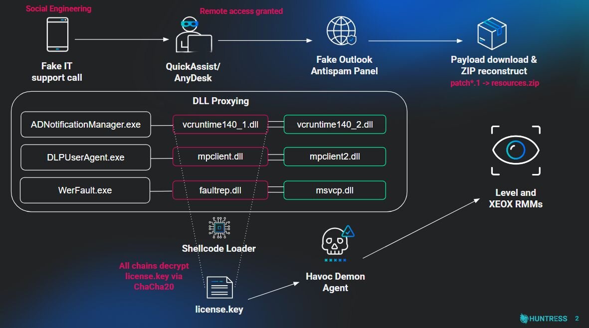 “What begins as a phone call from ‘IT support’ ends with a fully instrumented network compromise – modified Havoc Demons deployed across endpoints, legitimate RMM tools repurposed as backup persistence,” Huntress concluded. “This campaign is a case study in how modern adversaries layer sophistication at every stage: social engineering to get in the door, DLL sideloading to stay invisible, and diversified persistence to survive remediation.”