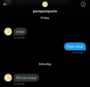 On that same night, around 10 p.m. EST, Pompompurin also gave Troia a jeering heads-up, direct-messaging him on Twitter to say “Enjoy” and then following up on Saturday to see if Troia had in fact enjoyed himself. The sparse conversation is shown below in a screen capture:
