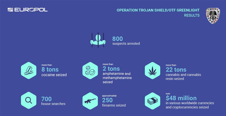 Dubbed Operation Ironside (AFP), Operation Greenlight (Europol), and Operation Trojan Shield (FBI), the long-term covert probe into transnational and serious organized crime culminated in the arrests of 224 offenders on 526 charges in Australia, with 55 luxury vehicles, eight tons of cocaine, 22 tons of cannabis and cannabis resin, 250 firearms, and more than $48 million in various currencies and cryptocurrencies seized in raids around the world.