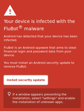 The Flubot banking trojan is using a fake security warning to try to trick Android users into thinking that they’ve already been infected … with Flubot.
