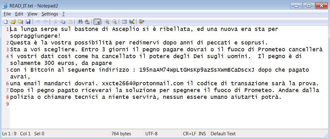 It’s up to you to choose. Within 3 days the pledge to pay you will have to or the fire of Prometheus will cancel your data just as it has wiped out the power of Gods over men. The pledge is only 300 euros, to be paid with Bitcoins at the following address: 195naAM74WpLtGHsKp9azSsXWmBCaDscxJ after you have paid, an email to send us you will. [email protected] the transaction code will be the proof.