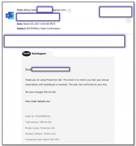 Geek Squad is an IT support service focused on consumers and small-businesses, owned by consumer electronics retailer Best Buy. In the first campaign that Armorblox uncovered, the scammers impersonated the service by sending emails (from a Gmail account) that masqueraded as a renewal confirmation for an annual protection service.