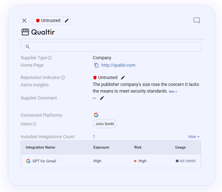 In the images below you can see the details from the Astrix platform about a risky Gen-AI integration that connects to the organization’s Google Workspace environment.