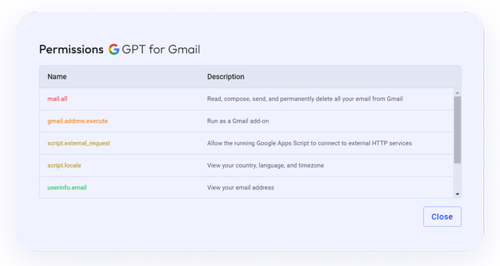 This integration, Google Workspace Integration “GPT For Gmail”, was developed by an untrusted developer and granted with high-permissions to the organization’s Gmail accounts: