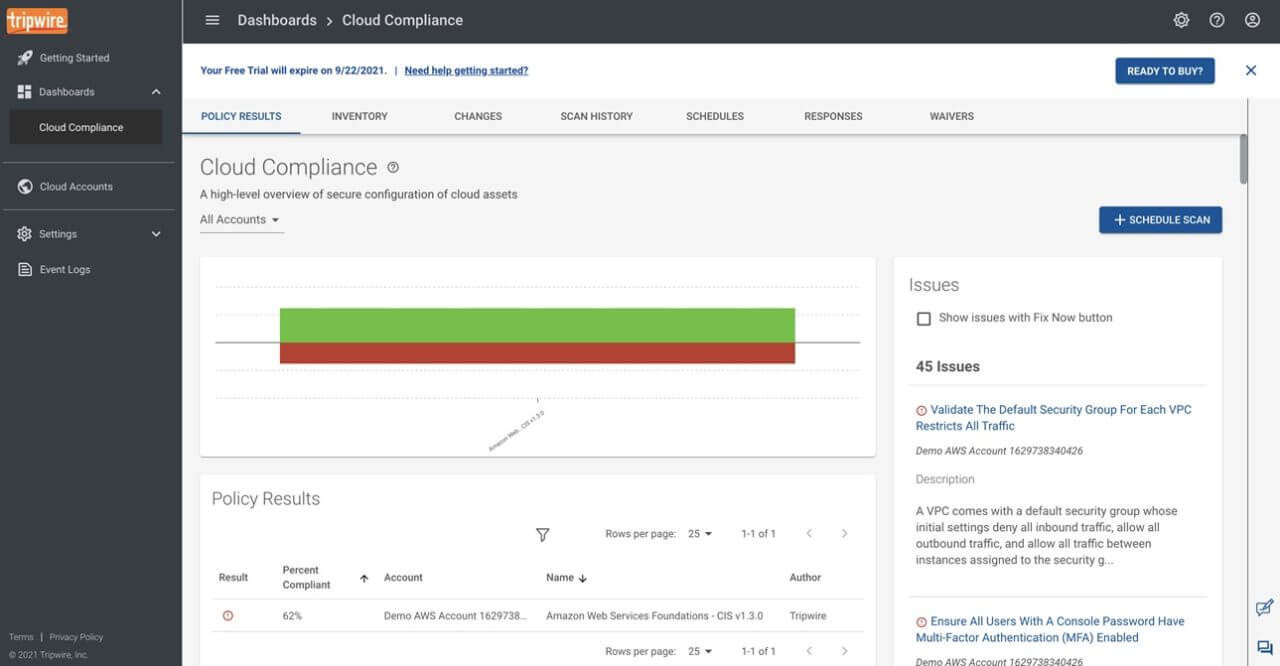 Within minutes of starting your free trial, you will learn about the features of Tripwire Configuration Manager and begin evaluating the security posture of your organizational cloud accounts.