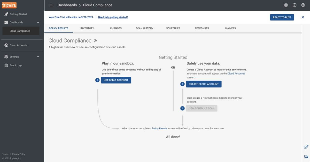You can begin by configuring your own accounts to scan for misconfigurations, or you can use a Tripwire Demo AWS account in our sandbox. Using a demo account will allow you to learn about the capabilities without needing any of your own cloud accounts. You can always add additional cloud accounts at a later time, as well.