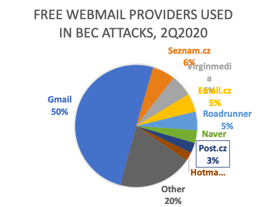 Agari found that 72% of BEC attacks sent in Q2 2020 emanated from free webmail attacks. (That was up from 61% the previous quarter.) Half of those attacks came from Gmail accounts.