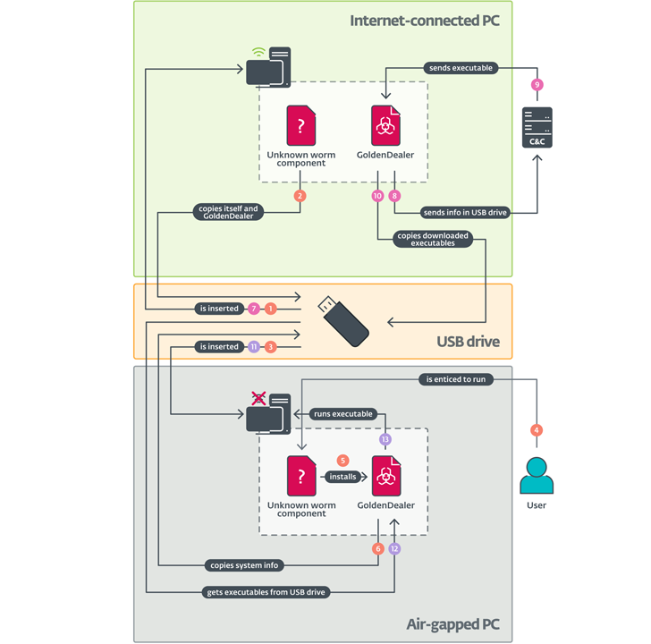 - GoldenDealer, which is used to deliver executables to the air-gapped system via compromised USB drives