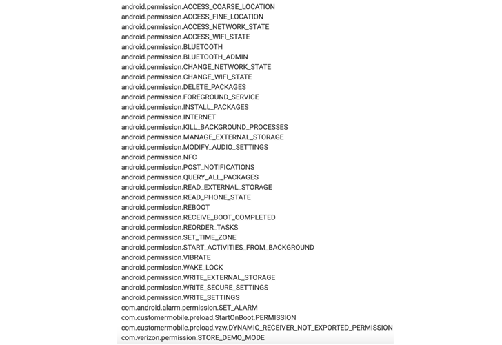 The app in question is called Verizon Retail Demo Mode (“com.customermobile.preload.vzw”), which requires nearly three dozen different permissions based on artifacts uploaded to VirusTotal earlier this February, including location and external storage. Posts on Reddit and XDA Forums show that the package has been around since August 2016.