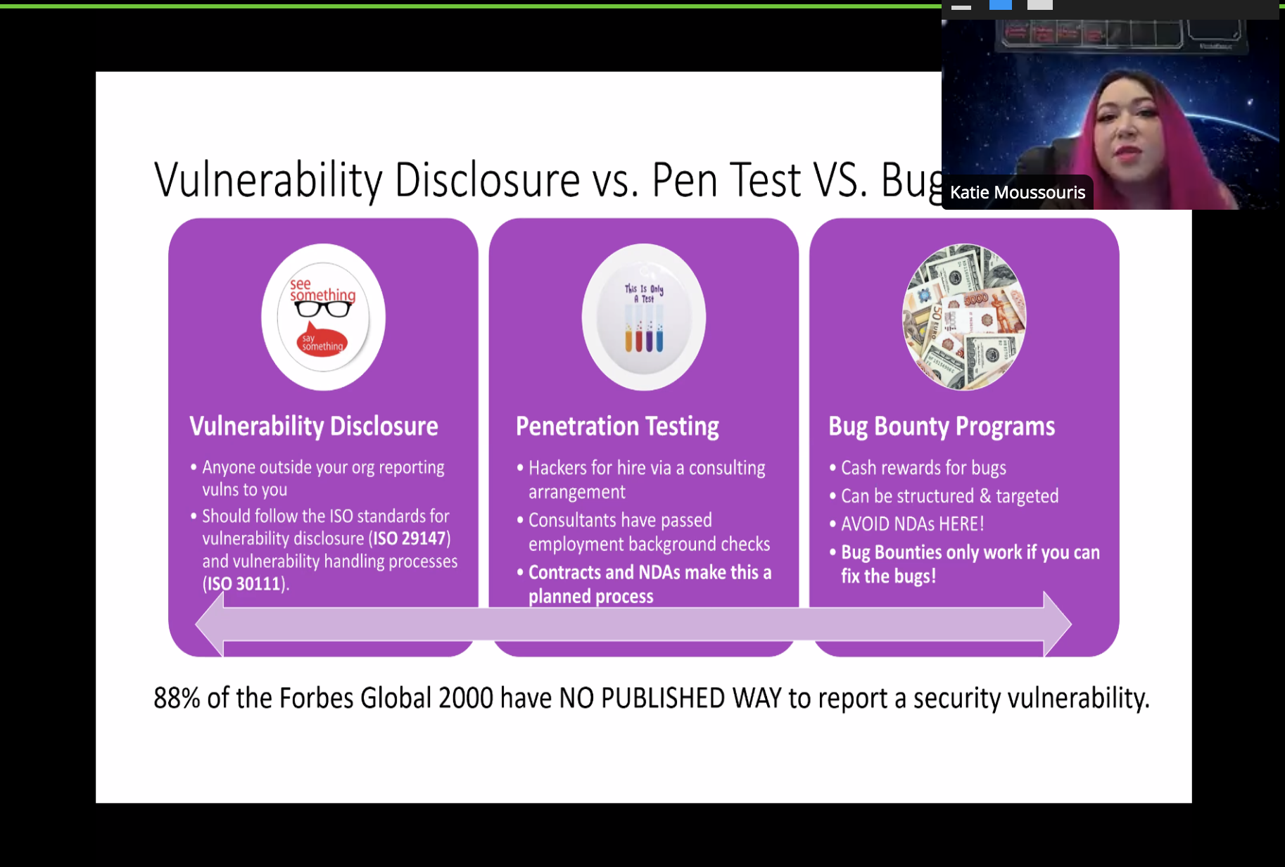 Katie Moussouris talks about the separate definitions of VDPs, bug-bounty programs and pentesting during SAS@Home.