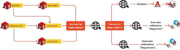 The attack chain spans multiple stages, with the “raydium” package listing “spl-types” as a dependency in an attempt to conceal the malicious behavior and give users the impression that it was legitimate.
