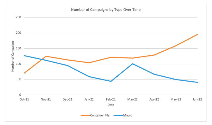 “The use of VBA and XL4 Macros decreased approximately 66% from October 2021 through June 2022,” Proofpoint said in a report shared with The Hacker News.