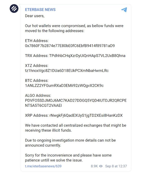 On Monday night, malicious threat actors managed to raid six Eterbase’s hot wallets for Bitcoin, Ethereum, XRP, Tezos, Algorand, and TRON and transferred the funds into their wallets managed at six rival crypto exchanges, Eterbase reported on its Telegram channel on Tuesday.
