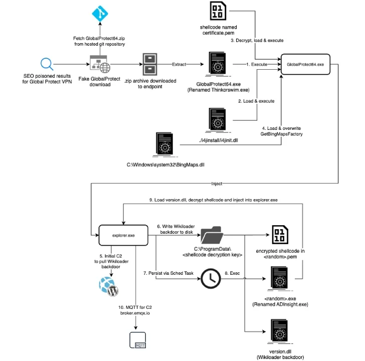 A new malware campaign is spoofing Palo Alto Networks’ GlobalProtect VPN software to deliver a variant of the WikiLoader (aka WailingCrab) loader by means of a search engine optimization (SEO) campaign.