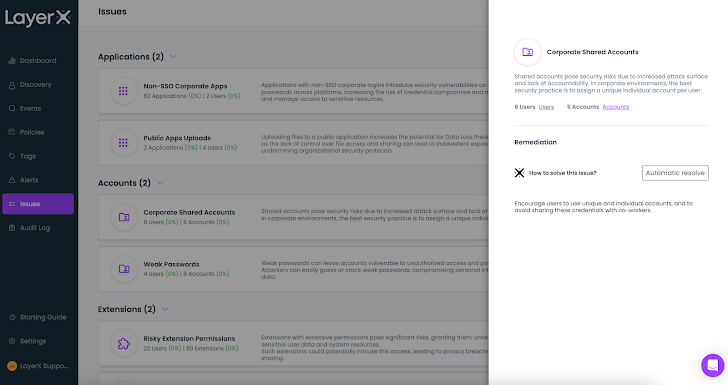 | Figure 4: The LayerX Issues screen displaying Account and Application issues |