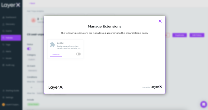 Once activated, any attempt to download an extension that’s not included in the list will trigger a protective action. The employee will receive a pop-up informing them that the extension violates the organization’s policy. Based on the action configured in the policy, LayerX will either ask the employee to disable the extension or take action to automatically deactivate it.