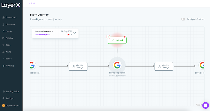 For example, the following event journey for a data upload policy shows that the employee uploaded a file to their personal Gmail and then switched back to their work account. Detecting and blocking such an event is a unique capability that can’t be performed by any CASB or other application-oriented security tool, since they lack the capability to differentiate between accounts for the same app.