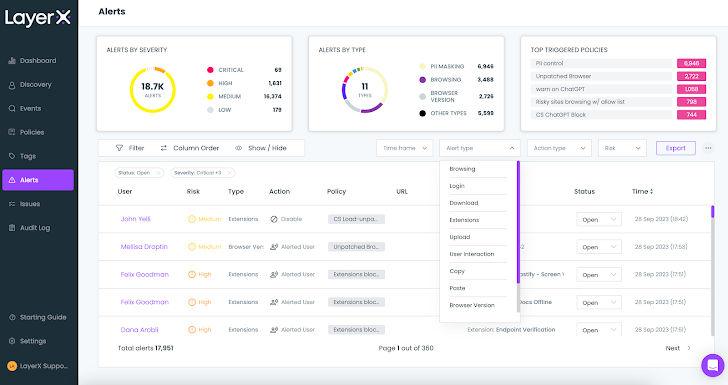 | Figure 14: The LayerX access Alerts screen with the Alert Type dropdown |