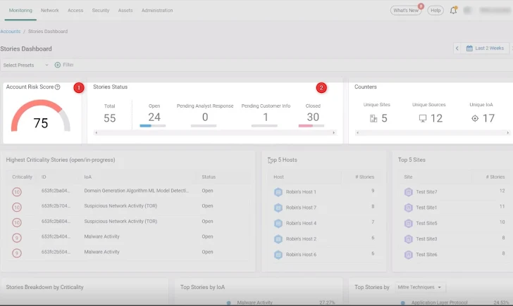 Below the overall summary line, we have widgets help us understand our stories from different perspectives. The highest priority stories are sorted by an AI-powered criticality store (1). The score is based on all the story risk scores for the selected time range and is calculated using a formula developed by the Cato research and development team. This is helpful in telling us which stories should be addressed first. We can also quickly see the hosts (Top 5 Hosts) and sites (Top 5 Sites) involved in the most stories (2). Scrolling down we see additional graphs capturing the story breakdown by criticality (3); Indicator of Attack (IoA) such as Malware Activity, Domain Generation Algorithm (DGA), and Suspicious Network Activity (4); and MITRE ATT&CK techniques, such as Application Layer Protocol, Exfiltration Over C2 Channel, and Automated Exfiltration Mitigation (5).