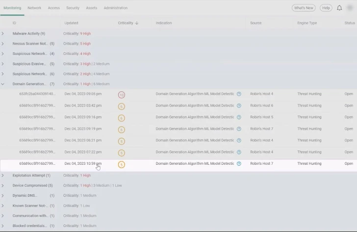 We decided to examine the distribution of threats in the Stories Workbench screen by grouping threats by their Unique Indications. Now, we can see threats by category — Malware Activity, Suspicious Network Activity, Domain Generation Algorithm (DGA), and so on. DGA is a technique used by malware authors to dynamically generate many domain names. This is commonly employed by certain types of malware, such as botnets and other malicious software, to establish communication with command-and-control servers. We went to the final story at 10:59 PM and opened it for investigation.