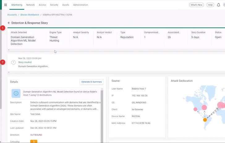We can see that the story duration is nine days, indicating that we found Associated Signals within a time span of nine days, and of course, that the status of the story is open. Next, we see the status line, which records the actions that took place in the story (2). Currently, we see that the status was “created.” Additional actions will be added as we work on the story. Moving on to the details, we can quickly see that the Domain Generation Algorithm, or DGA, was found on Robin’s Host 7. We see that the attack direction is outbound, and the AI-powered criticality score is 5.