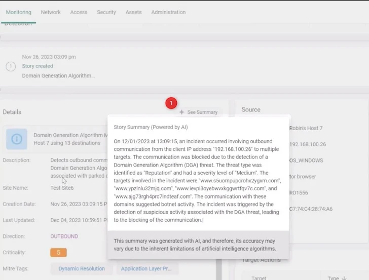 For an easy-to-read understanding of the story, we can click on the “See Summary” button. Cato’s Gen AI engine summarizes the results of the screen in easy-to-read text. Details include the type of communication, the IP source, the targets, why the story was detected, and if any actions were taken automatically, such as blocking the traffic.