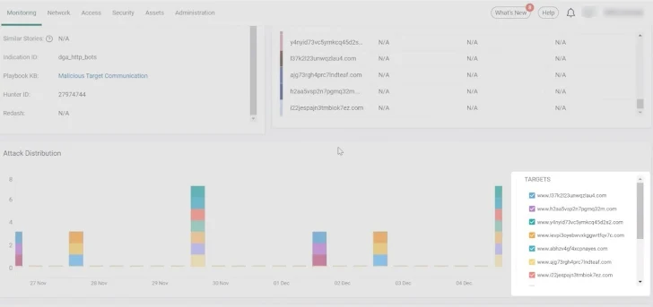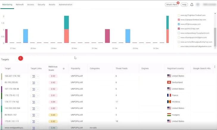 By filtering out some of the targets, we can see patterns of communications, which are easily observable. We clearly see a periodic activity that is indicative of bot- or script- initiated communication. Under the attack timeline, the Targets table (1) provides additional details about the targets, including their IPs, domain names, and related threat intelligence. The targets are sorted by malicious score. This is a smart score powered by AI and ML that takes all of Cato’s threat intelligence sources, both proprietary and third party, and calculates the score between zero and one to indicate whether the IP is considered highly malicious or not.