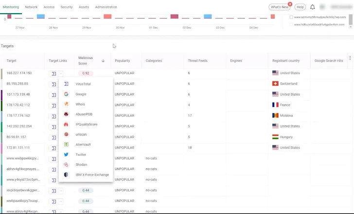 | External threat intelligence sources are just a click away from within the Targets table. |