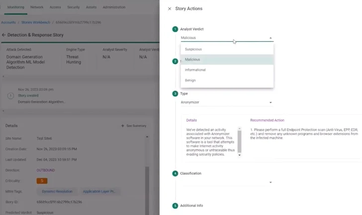 Now let’s set up the verdict in the screen below. We’ll classify the story as malicious. The analyst severity would be medium. The type is anonymizer. We can see the details in the image below. The classification would be DGA. Then we can save the verdict on this incident story.