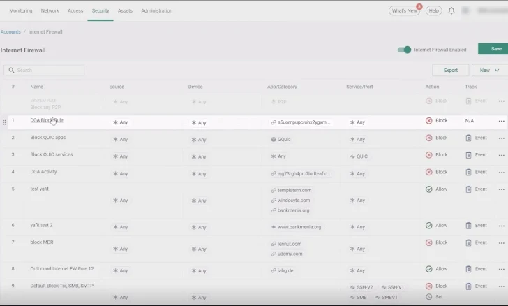 Normally, analysts would need to jump to another platform to take action, but in the case of Cato it can all be done right in the XDR platform. A block rule can be easily created in Cato’s Internet firewall to prevent the spread of the malware. We copy the target domain that appears in the attack network flows, add the domain to the App/Category section of the firewall rule, and hit apply. Worldwide the DGA domain is now blocked.